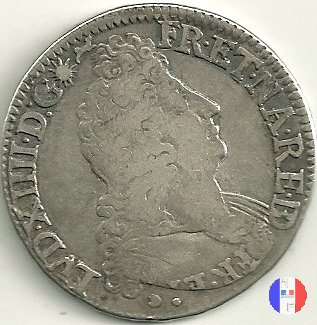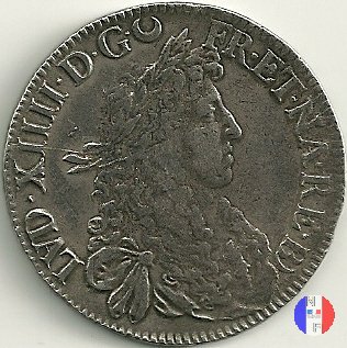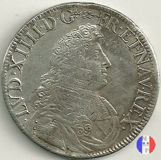 scudo " à la perruque" Dritto: ↻ •LVD.XIIII.D.G.FR.ET.NAV.REX Busto drappeggiato del re a destra. Verso: ↻ •SIT.NOMEN.DOMINI.(SZ).BENEDICTVM.(ANNO) Scudo di Francia coronato. | |
