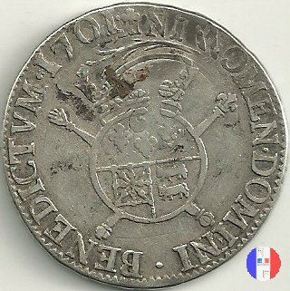 scudo delle Fiandre detto"carambole" Dritto: ↻ •LVDOVICVS.XIIII.D.G.FR.ET.NAV.REX Busto drappeggiato del re a destra. Verso: ↻ •SIT.NOMEN.DOMINI.(SZ).BENEDICTVM.(ANNO) Scudo coronato diviso in quattro quarti, contenenti gli stemmi di Francia,Borgogna moderna,Borgogna antica e Francia. | |