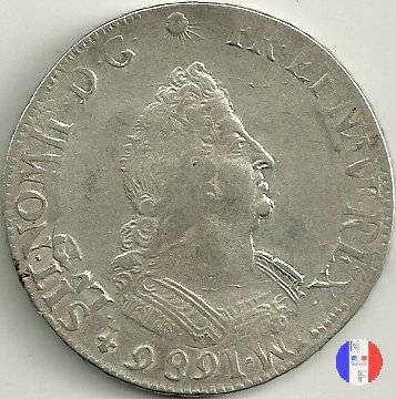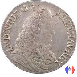 scudo " au jabot" Dritto: ↻ •LVD.XIIII.D.G.FR.ET.NAV.REX Busto del re a destra,corazzato,drappeggiato con parrucca e "jabot" al posto della cravatta. Verso: ↻ •SIT.NOMEN.DOMINI.(SZ).BENEDICTVM.(ANNO) Stemma coronato di Francia. | |