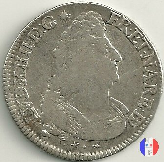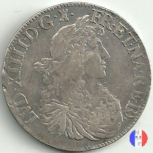 scudo " à la mèche longue" Dritto: ↻ LVD.XIIII.D.G.FR.ET.NAV.REX Busto infantile del re a destra, laureato,drappeggiato e corazzato all'antica,una lunga treccia sulla spalla. Verso: ↻ •SIT.NOMEN.DOMINI.(SZ).BENEDICTVM.(ANNO) scudo di Francia coronato. | |