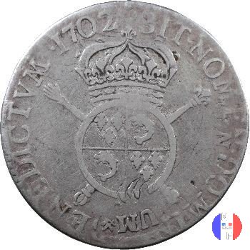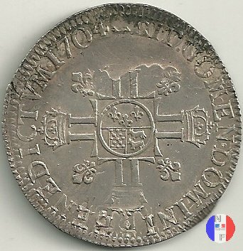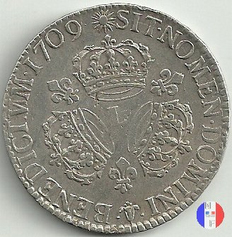 scudo " aux 3 couronnes" da 1709 a 1711 Dritto: ↻ LVD.XIIII.D.G.FR.ET.NAV.REX Busto del re a destra. Verso: ↻ SIT.NOMEN.DOMINI.BENEDICTVM.(ANNO) Tre corone separate da tre gigli,al centro il segno di zecca. | |