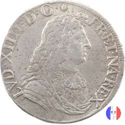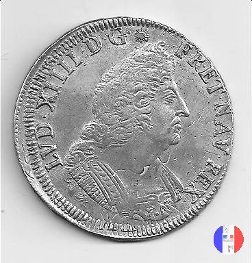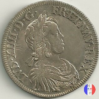 scudo " à la mèche courte" Dritto: ↻ LVD.XIIII.D.G.FR.ET.NAV.REX Busto infantile del re a destra, capelli corti,laureato ,drappeggiato e corazzato all'antica. Verso: ↻ •SIT.NOMEN.DOMINI.(SZ).BENEDICTVM.(ANNO) Scudo di Francia coronato. | |
