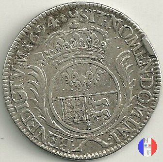scudo "aux 8 L" anno 1693 Dritto: ↻ LVD.XIIII.D.G.FR.ET.NAV.REX. Busto del re a destra.Data sotto il busto. Verso: ↻ CHRS.REGN.VINC.IMP. Croce formata da quattro coppie di 2 L coronate,quattro gigli cantonati,al centro il segno di zecca. | |