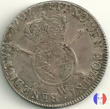 scudo "aux 3 couronnes" da 1712 a 1715 Dritto: ↻ LVD.XIIII.D.G.FR.ET.NAV.REX Busto del re a destra. Verso: ↻ SIT.NOMEN.DOMINI.BENEDICTVM.(ANNO) Tre corone separate da tre gigli,al centro il segno di zecca. | |