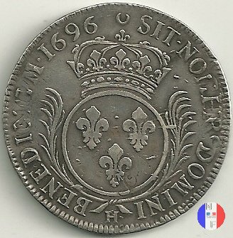 scudo "aux palmes" dal 1696 al 1700" Dritto: ↻ LVD.XIIII.D.G.FR.ET.NAV.REX. Busto del re a destra. Verso: ↻ SIT.NOMEN.DOMINI(SZ).BENEDICTVM (ANNO) Stemma rotondo di Francia coronato e contornato da due palme. | |