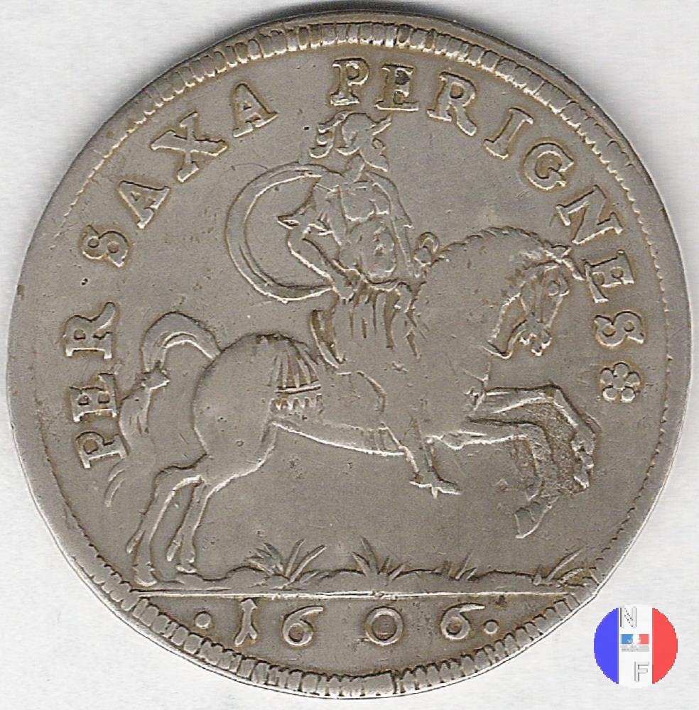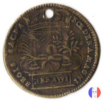 Per saxa per ignes Dritto: PIETATE ET IVSTITA - HK Due colonne coronate; in mezzo ad esse, un cuore (con al centro tre gigli, simbolo dei Borbone) sormontato da corona. Ai lati, due cornucopie da cui fuoriescono dei rami. Verso: PER SAXA PER IGNES - • anno • Un cavaliere, elmato e mantellato, avanza su un prato, verso destra. | |