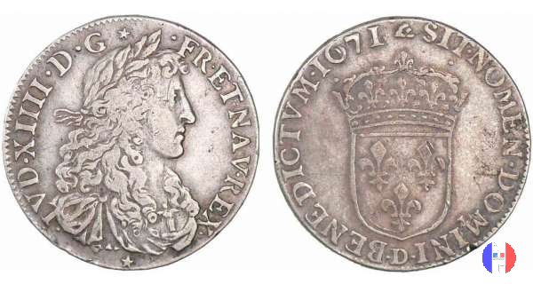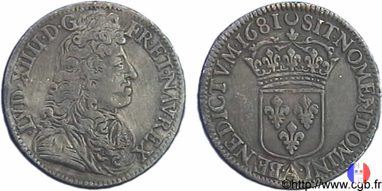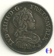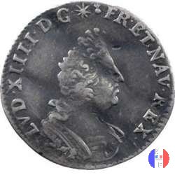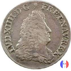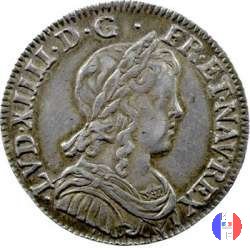 1/24 scudo a la mèche courte Dritto: ↻ LVD.XIIII Busto laureato e drappeggiato del re a destra. Verso: ↻ D.G.FR.ET.NAV.REX Stemma di Francia coronato. | |