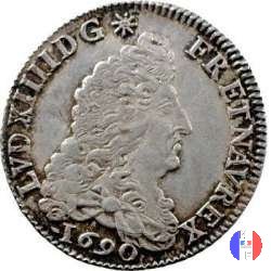 1/12 scudo agli 8L secodo tipo Dritto: ↻ LVD.XIIII.D.G.FR.ET.NAV.REX Busto del re a destra. Verso: ↻ SIT.NOMEN.DOMINI.(SZ).BENEDICTVM.(ANNO) Croce formata da quattro gruppi di 2L coronati,cantonati da quattro gigli.Al centro piccolo stemma rotondo di Francia. | |
