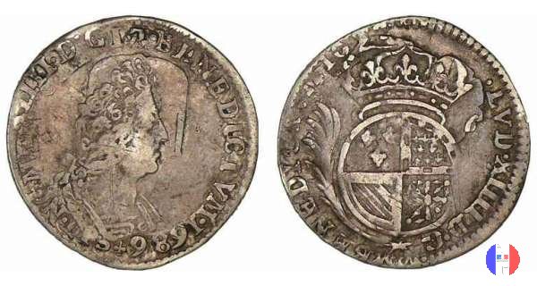 1/12 scudo agli 8 L Dritto: ↻ LVD.XIIII.D.G.FR.ET.NAV.REX Busto del re a destra.Data sotto il busto. Verso: ↻ CHRS.REGN.VINC.IMP. Croce formata da quattro coppie di 2 L coronate,quattro gigli cantonati,al centro il segno di zecca. | |