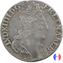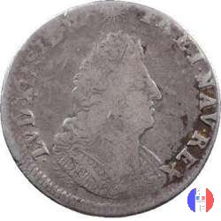 1/12 scudo al "jabot" Dritto: ↻ LVD.XIIII.D.G.FR.ET.NAV.REX Busto del re a destra,corazzato,drappeggiato con parrucca e "jabot" al posto della cravatta. Verso: ↻ SIT.NOMEN.DOMINI.(SZ).BENEDICTVM.(ANNO) Scudo di Francia coronato. | |