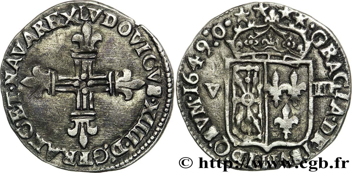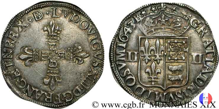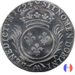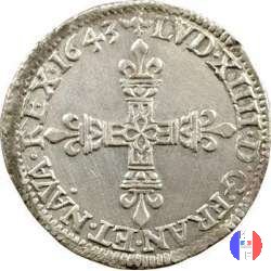 4 Sols detta dei "traitants" Dritto: ↻ LVDOVICVS.XIIII.D.GRA. Busto del re a destra. Verso: ↻ FRAN.ET.NAVARRAE.REX Croce coronata formata da quattro gigli,segno di zecca al centro. | |