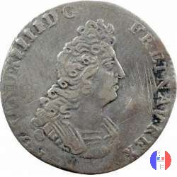 1/4 scudo al Jabot Dritto: ↻ LVD.XIIII.D.G.FR.ET.NAV.REX Busto del re a destra,corazzato,drappeggiato con parrucca e "jabot" al posto della cravatta. Verso: ↻ SIT.NOMEN.DOMINI.(SZ).BENEDICTVM.(ANNO) Scudo di Francia coronato. | |