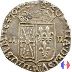 1/4 scudo conio al martello croce al dritto Dritto: ↻ LVDOVICVS.XIIII.D.G.FRAN.ET.NAV.REX. Croce gigliata. Verso: ↻ SIT.NOMEN.DNI.BENEDICTVM. Scudo di Francia coronato,accostato da due II II. | |
