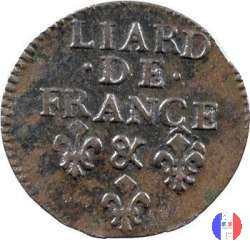 Liard di Francia I tipo Dritto: ↻ LOVIS.XIIII.ROY.DE.FRAN.ET.NA Busto giovanile coronato (volto a destra) del re Luigi XIV. Verso: ↻ LIARD.DE.FRANCE L coronata ed accostata da due gigli,in esergo la data con la sigla della zecca. | |