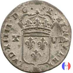 16 denari di Strasburgo Dritto: ↻ LVD.XIIII.D.G.FR.ET.NAV.REX. Scudo di Francia coronato accostato da X VI segno di zecca in esergo. Verso: ↻ SIT.NOMEN.DOMINI.BENEDICTVM (ANNO) Croce gigliata. | |