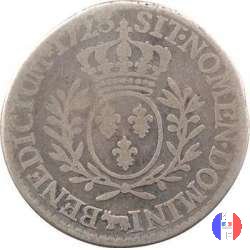 1/5 di scudo aux branches dal 1726 al 1727 Dritto: ↻ LUD.XV.D.G.FR.ET NAV.REX. Busto abbigliato del re a sinistra. Monogramma JCR in corsivo sul taglio della spalla. Verso: ↻ SIT NOMEN DOMINI(SZ)BENEDICTUM (ANNO) Stemma ovale di Francia coronato,e contornato da due rami d'olivo. | |
