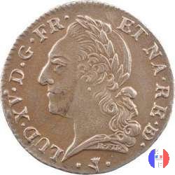 1/5 di scudo alla Vieille Tete Dritto: ↻ LUD.XV.D.G.FR.ET NAV.REX. Testa laureata del re a sinistra,busto drappeggiato.Sul collo "R.FIL" Verso: ↻ SIT NOMEN DOMINI(SZ)BENEDICTUM (ANNO) Stemma ovale di Francia,coronato tra due rami d'olivo. | |