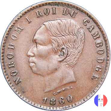 5 centesimi Dritto: NORODOM I ROI DU CAMBODGE - C.WURDEN - 1860 Busto (volto a sinistra) del re Norodom I° Verso: (legenda in caratteri cambogiani) • CINQ CENTIMES • Stemma della Cambogia | |