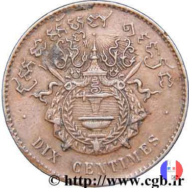10 centesimi Dritto: NORODOM I ROI DU CAMBODGE - C.WURDEN - 1860 Busto (volto a sinistra) del re Norodom I° Verso: (legenda in caratteri cambogiani) • DIX CENTIMES • Stemma della Cambogia | |